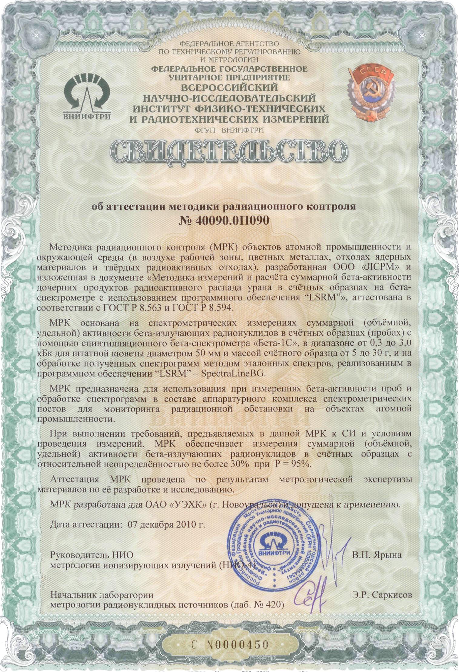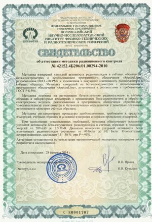 Методика радиационного контроля (МРК) объектов промышленности и окружающей среды, разработанная ООО «ЛСРМ» и изложенная в документе «Методика измерений и расчета суммарной бета-активности дочерних продуктов радиоактивного распада урана в счетных образцах на бета-спектрометре с использованием программного обеспечения «LSRM», аттестована в ФГУП «ВНИИФТРИ» в соответствии с ГОСТ Р 8.563 и ГОСТ Р 8.594.
