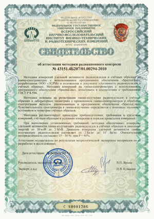 Методика измерений удельной активности радионуклидов в счётных образцах на гамма-спектрометрах с использованием программного обеспечения «SpectraLine»Методика измерений удельной активности радионуклидов в счётных образцах на гамма-спектрометрах с использованием программного обеспечения «SpectraLine», разработанная ООО «ЛСРМ» и изложенная в документе «Активность радионуклидов в счётных образцах. Методика измерений на гамма-спектрометрах с использованием программного обеспечения «SpectraLine», аттестована в соответствиями с требованиями ГОСТ Р 8.594.