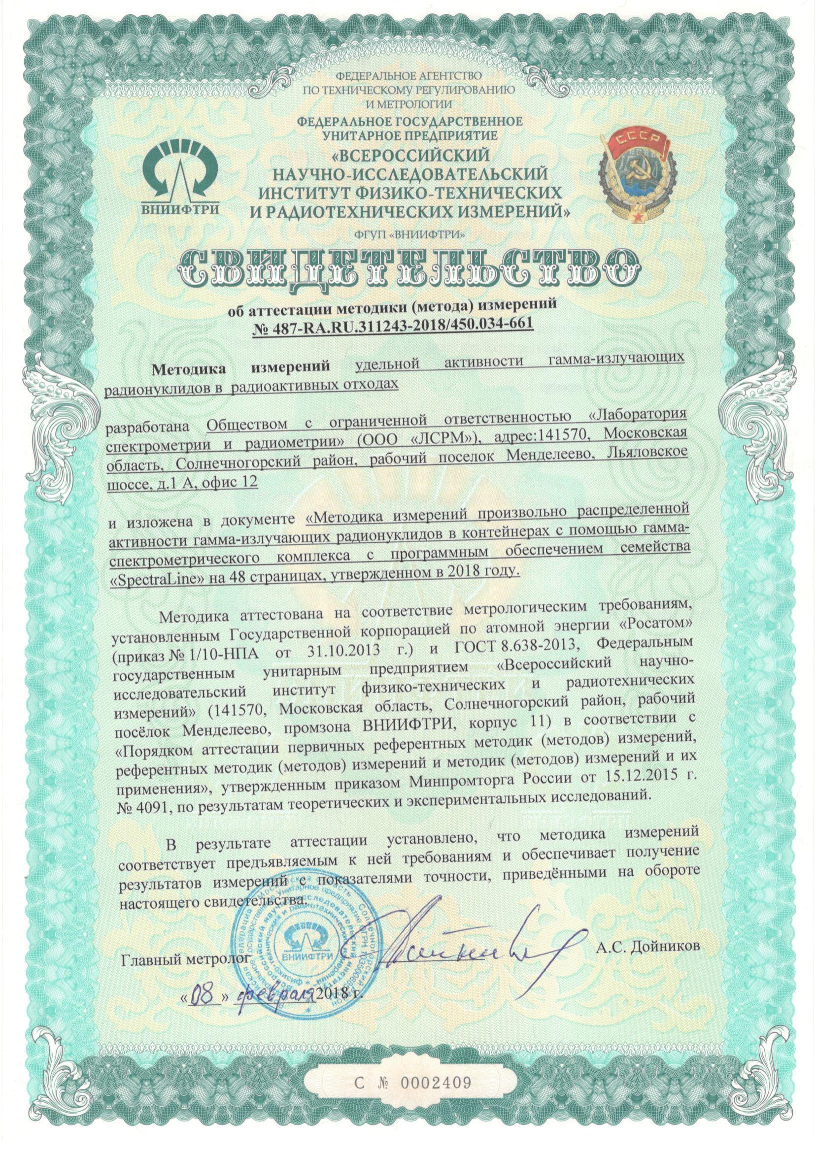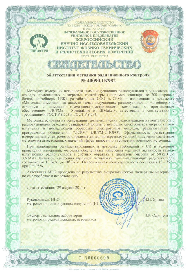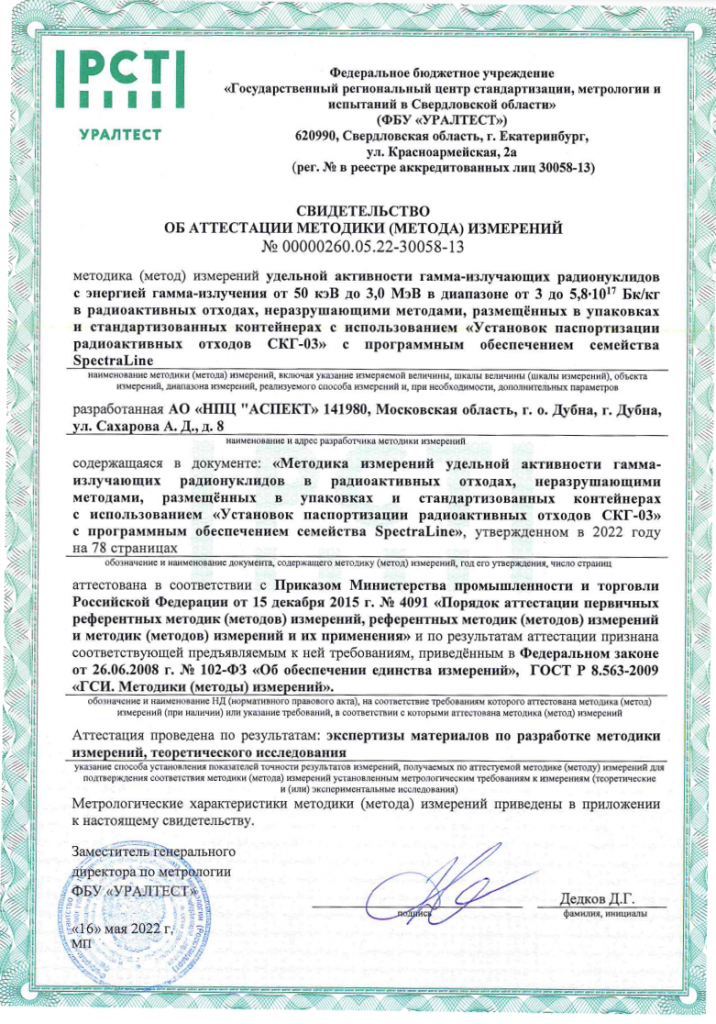 Методика измерений удельной активности гамма-излучающих радионуклидов в радиоактивных отходах, неразрушающими методами, размещённых в упаковках и стандартизованных контейнерах с использованием «Установок паспортизации радиоактивных отходов СКГ-03» с программным обеспечением семейства SpectraLine аттестована в соответствии с ГОСТ Р 8.563-2009.