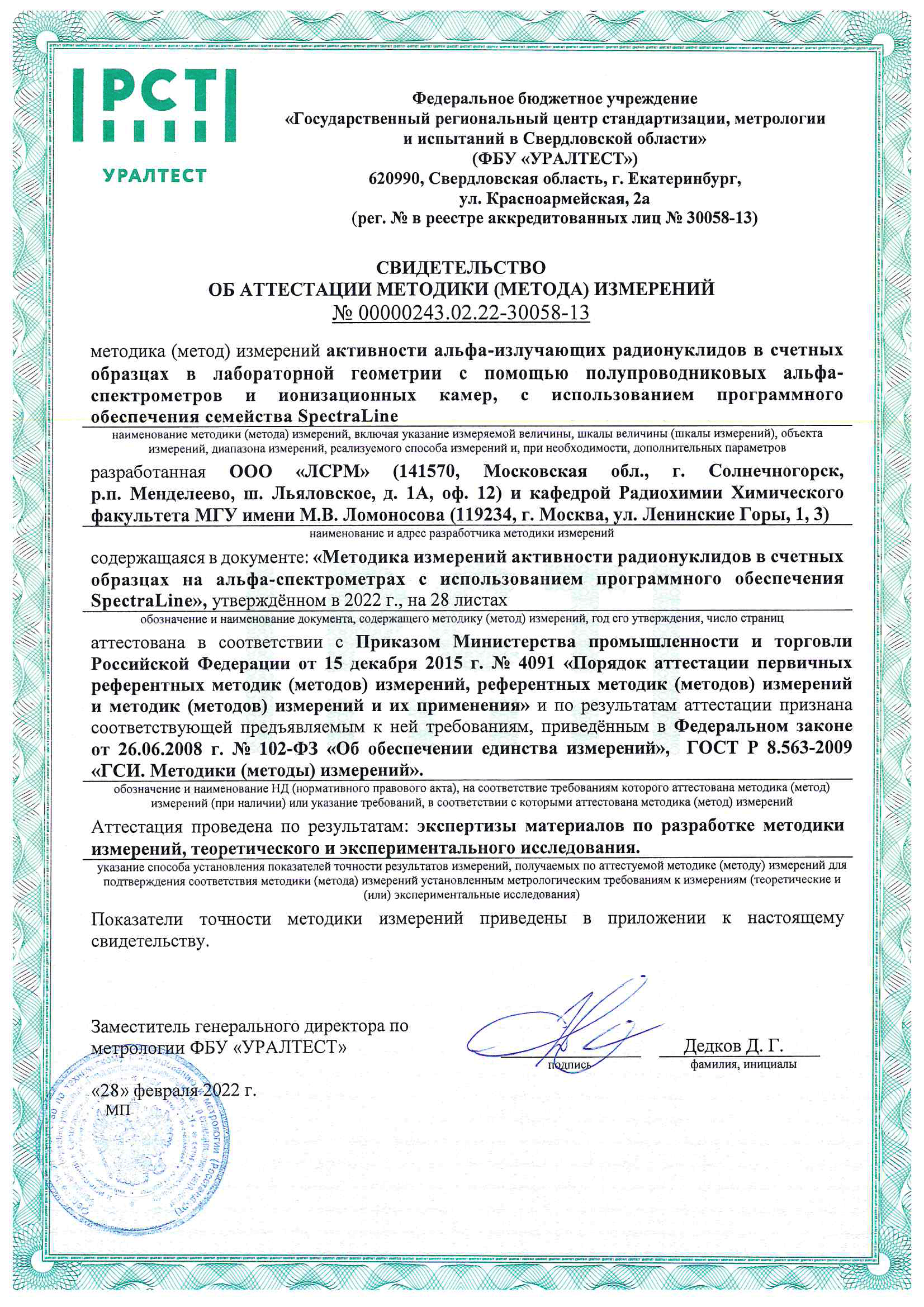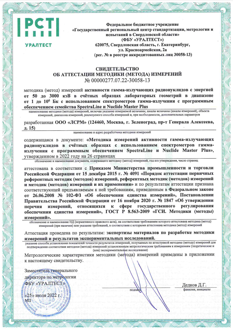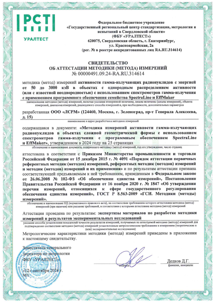 Для получения копии методик в электронном виде нужно выслать на электронный адрес lsrm@lsrm.ru скан сертификата пользователя программы семейства SpectraLine. Методика измерений активности гамма-излучающих радионуклидов в объектах сложной геометрической формы с использованием спектрометров гамма-излучения с программным обеспечением SpectraLine и EffMakerМетодика (метод) измерений активности гамма-излучающих радионуклидов с энергией от 50 до 3000 кэВ в объектах с однородным распределением активности (или с известной неоднородностью) с использованием спектрометров гамма-излучения с применением программного обеспечения семейства SpectraLine и EffMaker, разработанная ООО «ЛСРМ», аттестована в соответствии с Приказом Министерства промышленности и торговли Российской Федерации от 15 декабря 2015 г. № 4091 и по результатам аттестации признана соответствующей предъявляемым к ней требованиям, приведенным в Федеральном законе от 26.06.2008 № 102-ФЗ, Постановлении Правительства Российской Федерации от 16 ноября 2020 г. № 1847, ГОСТ Р 8.563-2009. Номер в Федеральном информационном фонде по обеспечению единства измерений ФР.1.38.2024.49576. Методика измерений активности гамма-излучающих радионуклидов в счётных образцах с использованием спектрометров гамма-излучения с программным обеспечением SpectraLine и Nuclide Master PlusМетодика измерений активности гамма-излучающих радионуклидов с энергией от 50 до 3000 кэВ в счётных образцах лабораторных геометрий в диапазоне от 1 до 106 Бк с использованием спектрометров гамма-излучения с программным обеспечением семейства SpectraLine и Nuclide Master Plus, разработанная ООО «ЛСРМ», аттестована в соответствии с Приказом Министерства промышленности и торговли Российской Федерации от 15 декабря 2015 г. № 4091 и по результатам аттестации признана соответствующей предъявляемым к ней требованиям, приведенным в Федеральном законе от 26.06.2008 № 102-ФЗ, Постановлении Правительства Российской Федерации от 16 ноября 2020 г. № 1847, ГОСТ Р 8.563-2009. Номер в Федеральном информационном фонде по обеспечению единства измерений ФР.1.38.2022.43932. Методика измерений произвольно распределенной активности гамма-излучающих радионуклидов в контейнерах с помощью гамма-спектрометрического комплекса с программным обеспечением семейства «SpectraLine»Методика измерений удельной активности гамма-излучающих радионуклидов в радиоактивных отходах, разработанная ООО «ЛСРМ» и изложенная в документе «Методика измерений произвольно распределенной активности гамма-излучающих радионуклидов в контейнерах с помощью гамма-спектрометрического комплекса с программным обеспечением семейства «SpectraLine», утвержденном в 2018 году, аттестована в соответствии с требованиями, установленными Государственной корпорацией по атомной энергии «Росатом» (приказ № 1/10-НПА от 31.10.2013 г.) и ГОСТ 8.638-2013. Номер в Федеральном информационном фонде по обеспечению единства измерений ФР.1.40.2018.30016. Заверенная копия свидетельства: