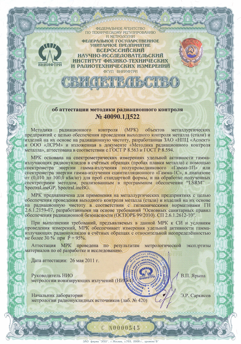 Методика радиационного контроля (МРК) объектов металлургических предприятий с целью обеспечения проведения выходного контроля металла (стали) и изделий на их основе на радиационную чистоту, разработанная ЗАО «НПЦ «Аспект» и ООО «ЛСРМ» и изложенная в документе «Методика радиационного контроля металла», аттестована в соответствии с ГОСТ Р 8.563 и ГОСТ Р 8.594.