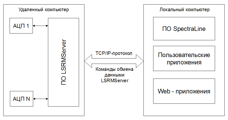 и пользовательскими desktop- или web-приложениями управляет этими АЦП, связываясь с удаленным компьютером по стандартному сетевому протоколу TCP/IP. Управление АЦП и обмен данными с LSRMServer формализованы в виде универсального набора команд.