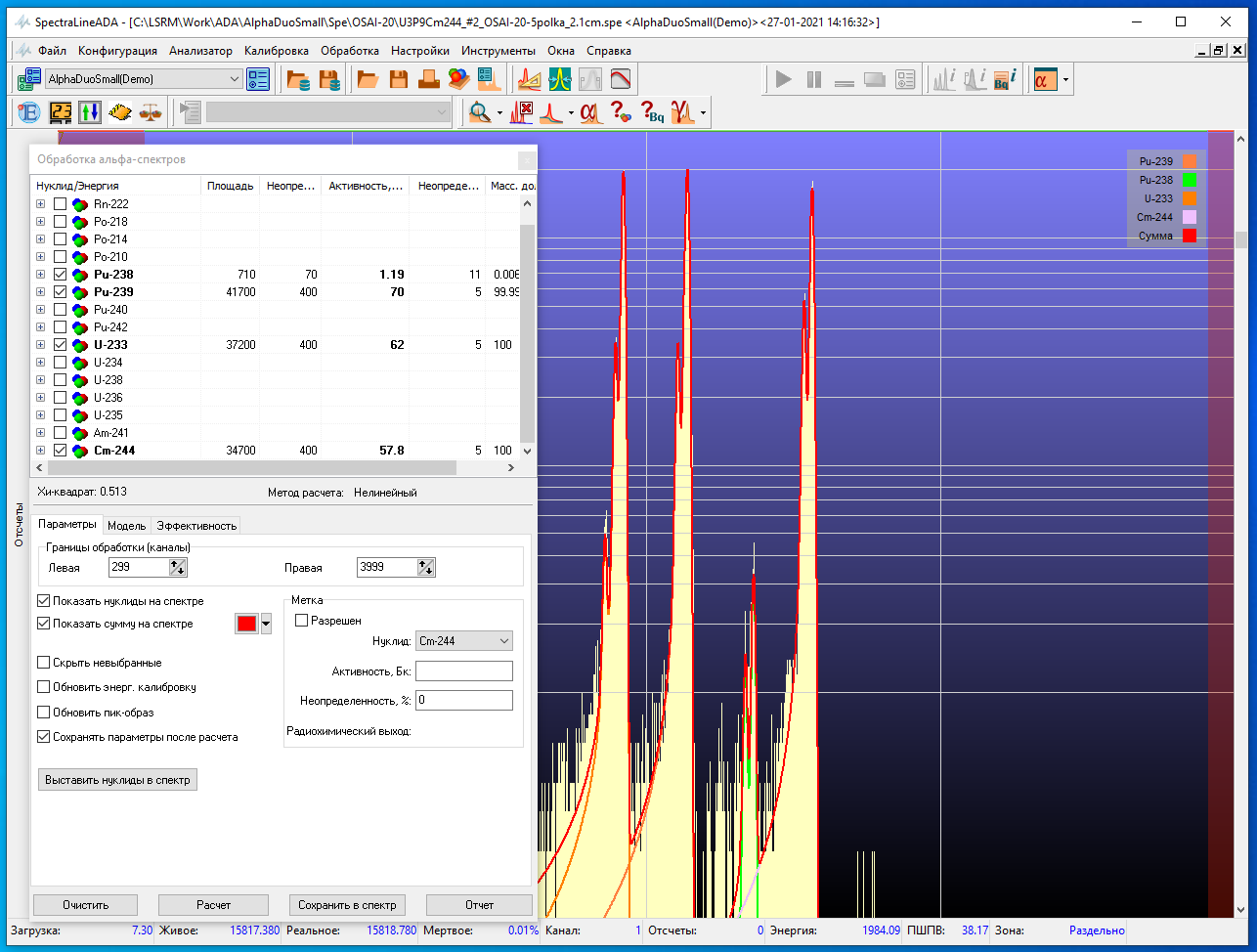 Программа SpectraLineADA (Alpha Decay Analysis) предназначена для альфа-спектрометрического анализа со спектрометрами как на основе ППД-детекторов, так и на основе ионизационных камер.