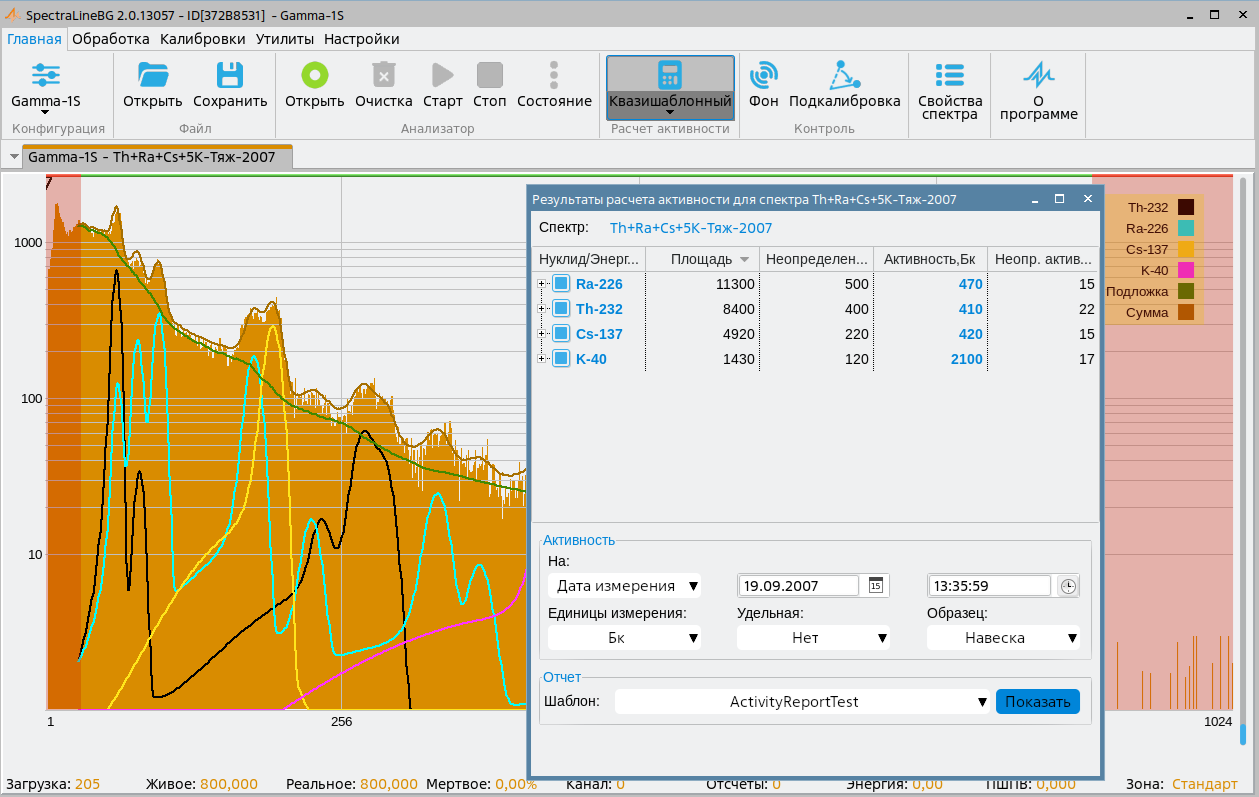 - учет времени измерения при измерении короткоживущих радионуклидов и выдача результатов расчета активности на время начала измерения с учетом цепочек распада;