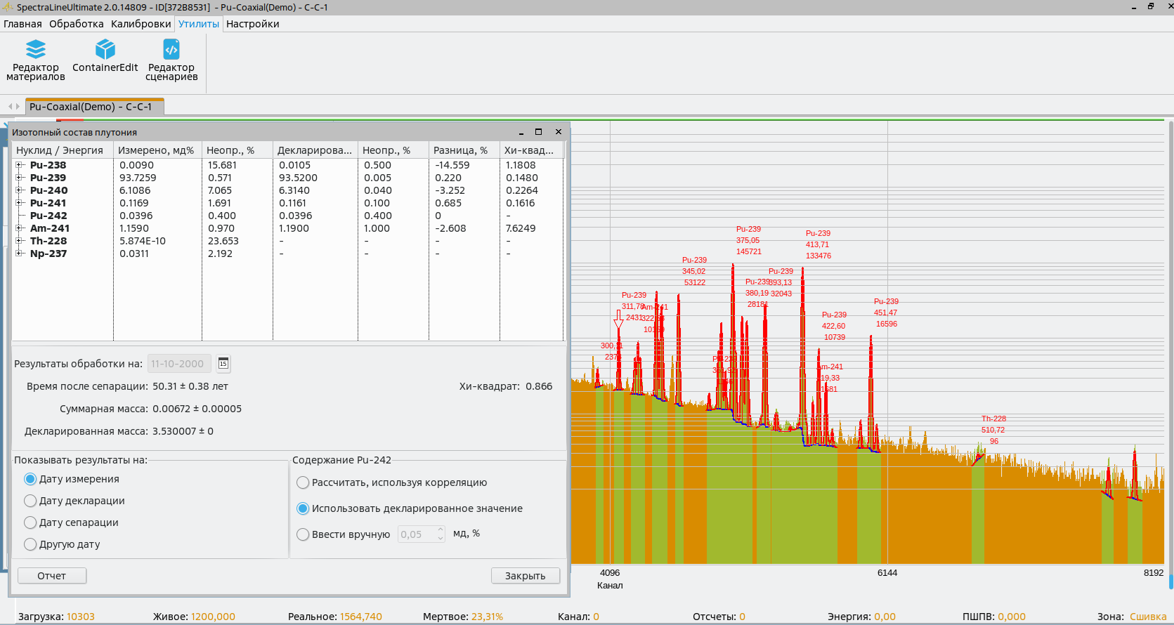 Программа SpectraLineUltimate предназначена для решения всех задач гамма-бета-спектрометрического анализа и объединяет в себе возможности SpectraLineGP, SpectraLineBG и SpectraLineHandy, а также опции для проведения экспертной идентификации и анализа ядерных материалов.